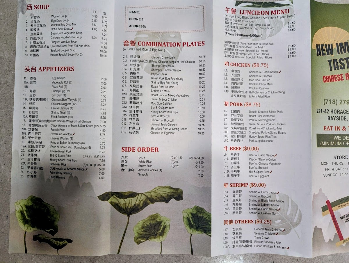 Imperial Taste offers a straightforward and satisfying menu that blends classic Chinese flavors with familiar, comforting dishes. Whether you're stopping by for a casual lunch or ordering a hearty dinner to enjoy at home, the menu features a range of well-loved staples like General Tso's Chicken, fried rice variations, and savory soups such as Hot Sour Soup and Egg Drop Wonton Soup.